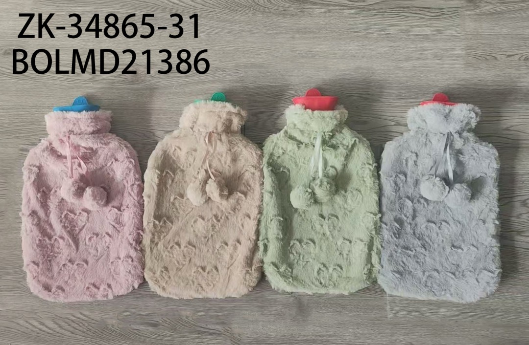 BOLSA DE GOMA CON FUNDA DE PELUCHE CON DETALLE DE POMPOMCITOS.